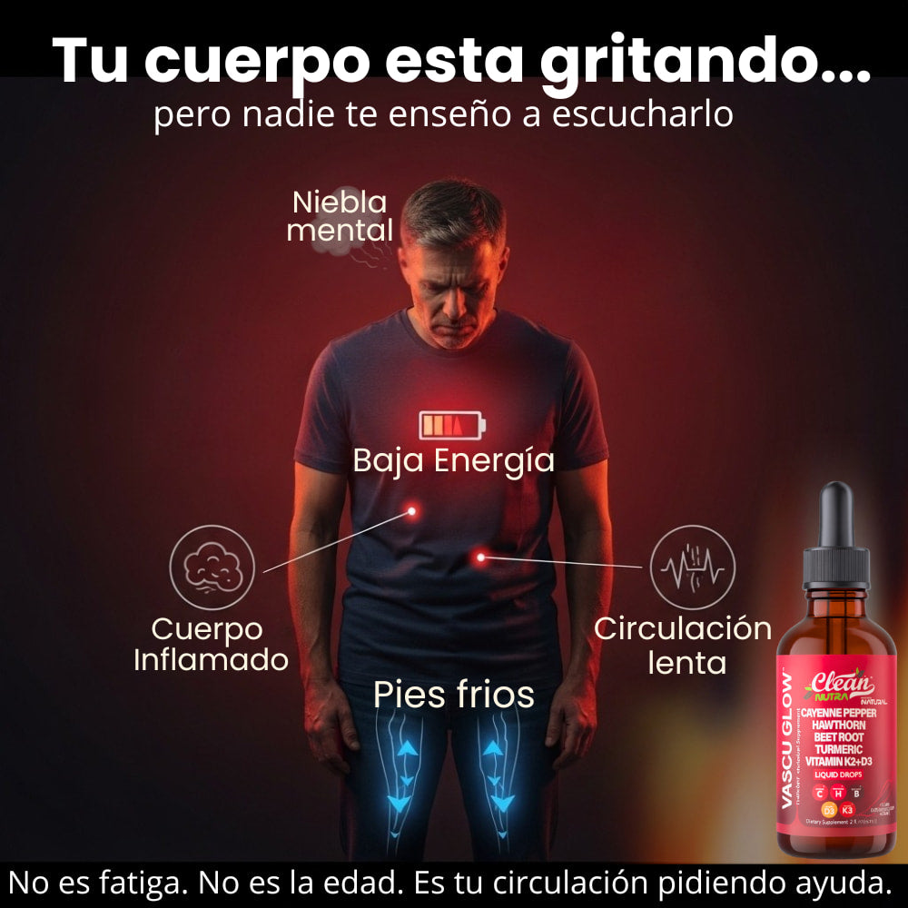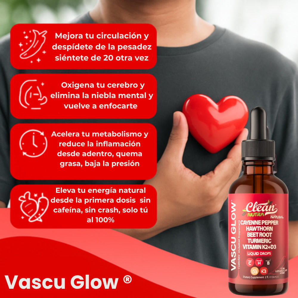 Cuando tu circulación mejora, todo cambia: tu mente se despeja, la pesadez desaparece y tu energía se enciende de verdad. Vascu Glow trabaja desde adentro, oxigenando tu sangre y reactivando tu metabolismo para que te sientas más liviano, enfocado y con ganas de moverte. Sin cafeína. Sin excusas. Solo resultados que se notan.