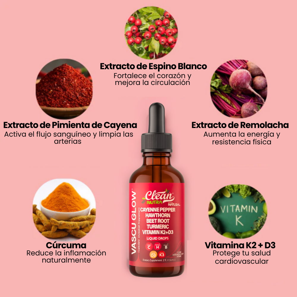 Vascu Glow combina lo mejor de la ciencia y la naturaleza. Su fórmula incluye Cayenne Pepper para activar tu circulación, Hawthorn Berry para el corazón, Beet Root para oxigenar tu cuerpo y Turmeric para reducir inflamación y mejorar claridad mental.
